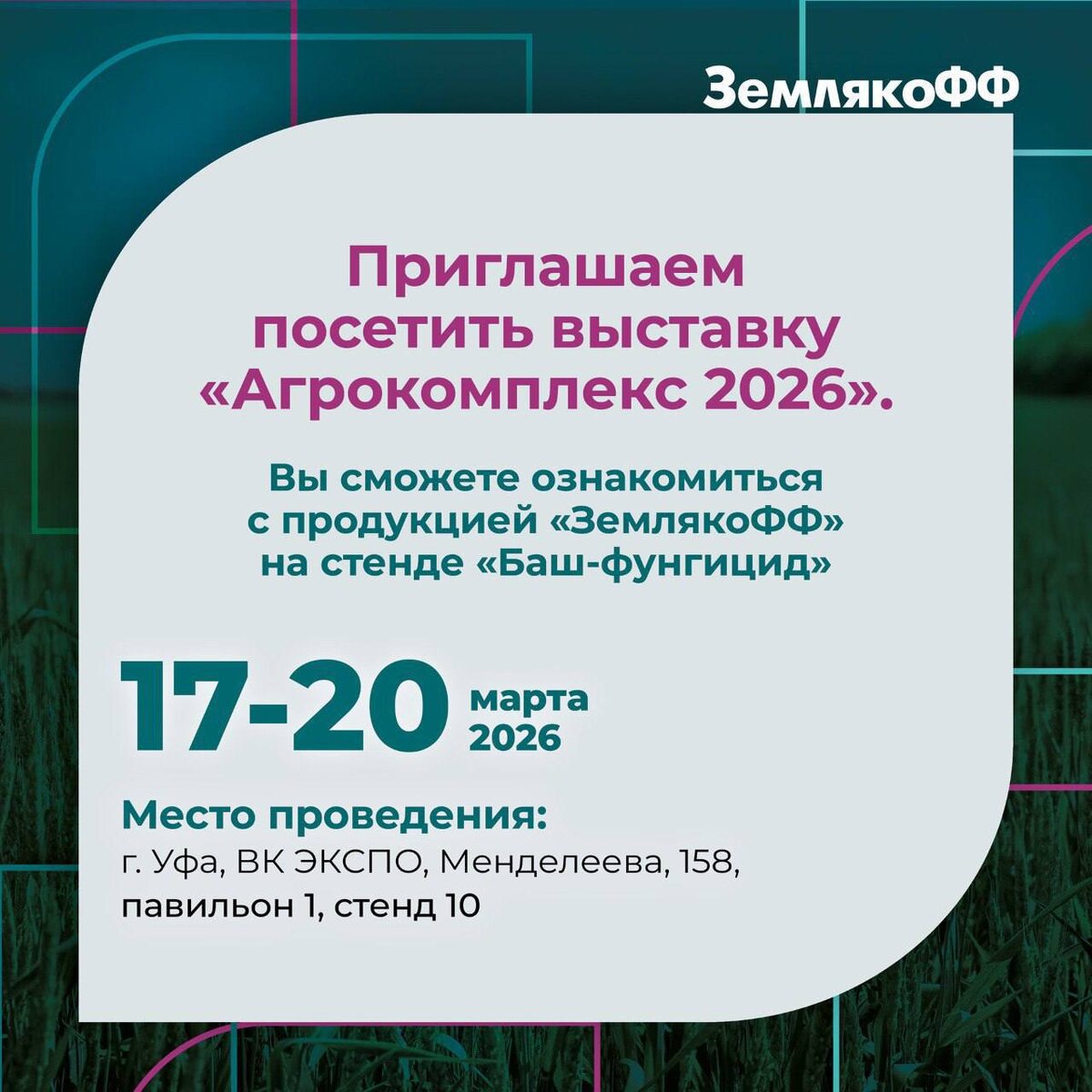 ! «ЗемлякоФФ» совместно с нашим дилером, компанией «Баш-Фунгицид», рады пригласить вас на 36-ю международную выставку «АгроКомплекс» в Уфе! Это крупнейший смотр достижений отечественного АПК, который пройдет в выставочном комплексе «ЭКСПО». 📅 Когда: 17 - 20 марта 2026 года 📍 Где: Уфа, ВК «Экспо», ул. Менделеева, 158 🏢 Павильон 1, стенд 10 На стенде №10 нашего дилера мы подробно расскажем о комплексной защите растений и представим актуальные препараты и линейку гибридов от «ЗемлякоФФ», а также ответим на все вопросы и предложим оптимальные решения для вашего агробизнеса. Деловая программа насыщена интересными мероприятиями. Не упустите возможность узнать о передовых технологиях, обменяться опытом и найти надежных партнеров! Ждем встречи с вами!