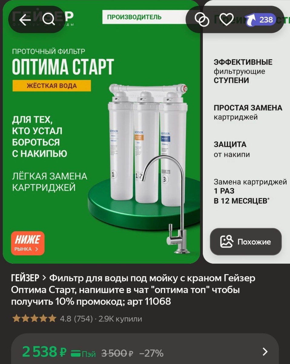Фильтр для воды под мойку с краном Гейзер Оптима Старт, напишите в чат "оптима топ" чтобы получить 10% промокод; арт 11068