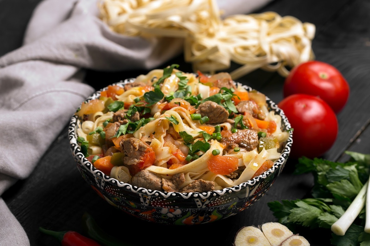 Лагман по-узбекски – это традиционное блюдо, которое характерно не только для Узбекистана, но и для других стран Центральной и Средней Азии. Оно представляет собой комбинацию длинной лапши, овощей, мяса и бульона, количество которого вариативно: от супа до основного блюда с минимальным количеством жидкости. Если вы не знаете, как приготовить лагман, рецепт классический представлен в статье и познакомит вас с азиатскими кулинарными традициями. Чтобы блюдо получилось ароматным, сытным и вкусным, рекомендуется добавлять в него разные овощи и мясо. Лагман из говядины – классический вариант. Но также можно использовать баранину. Свинину применяют реже, но и она подойдёт. И всё же многим нравится лагман с говядиной и картошкой, поэтому советуем начать знакомство с гастрономической Азией именно с него. Ниже – удачный вариант соуса на 4-6 порций. Что берём: Как готовим: Совет! Этот рецепт лагмана из говядины можно модифицировать, например, убрав картофель и заменив помидоры томатной пастой – д