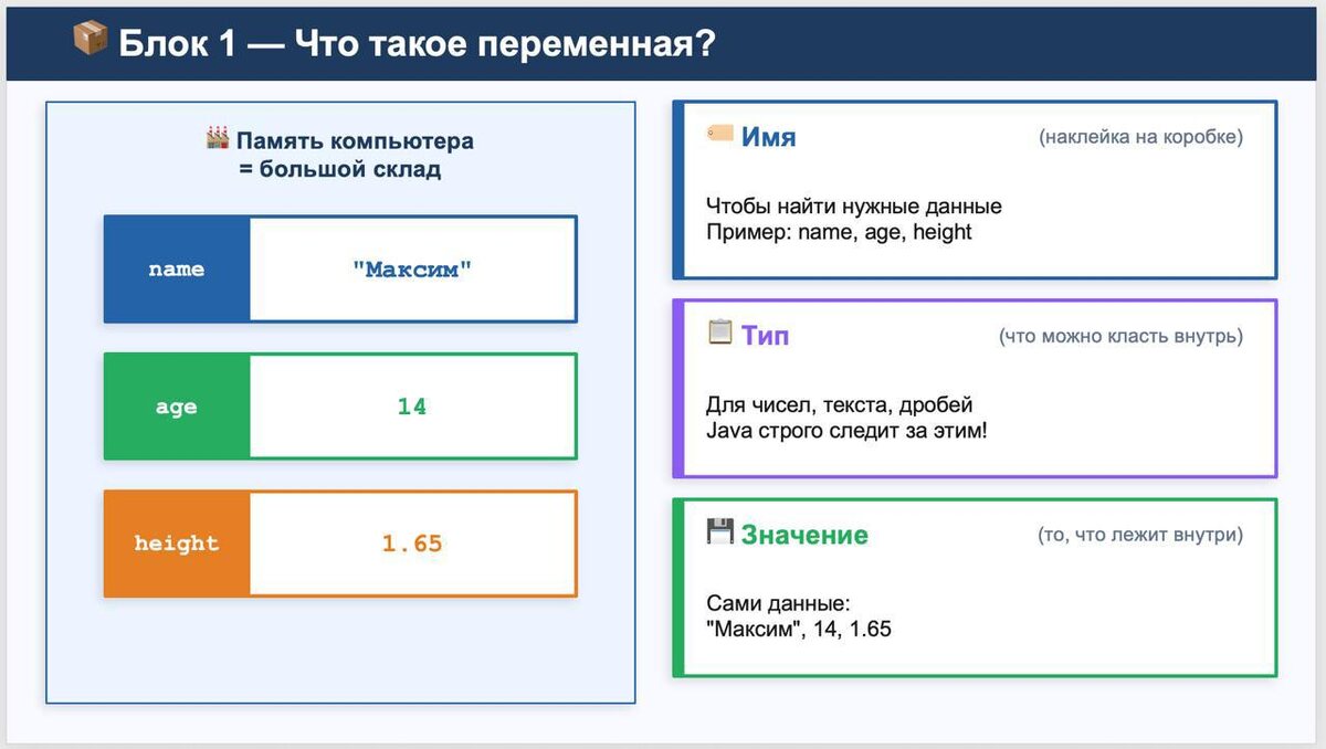 Каждая тема — отдельный видеоурок. Я объясняю на видео 5 минут, на экране — слайд с кодом и аналогией из жизни. Никаких скучных лекций. Только: Вопрос, который задаёт каждый новичок Аналогия — чтобы понял даже тот, кто никогда не программировал Код — короткий и понятный Задание — попробовать самому Вот слайды из урока про переменные. Смотри — и сразу понятно что происходит. Такой курс я делаю для детей от 8 лет и взрослых с нуля. Без занудства. Ну и Английский внутри 👀 #Объясняю просто — это принцип. 👇Напишите в комментарии: Вам или Вашему ребёнку было бы интересно учиться вот так? Я в MAX