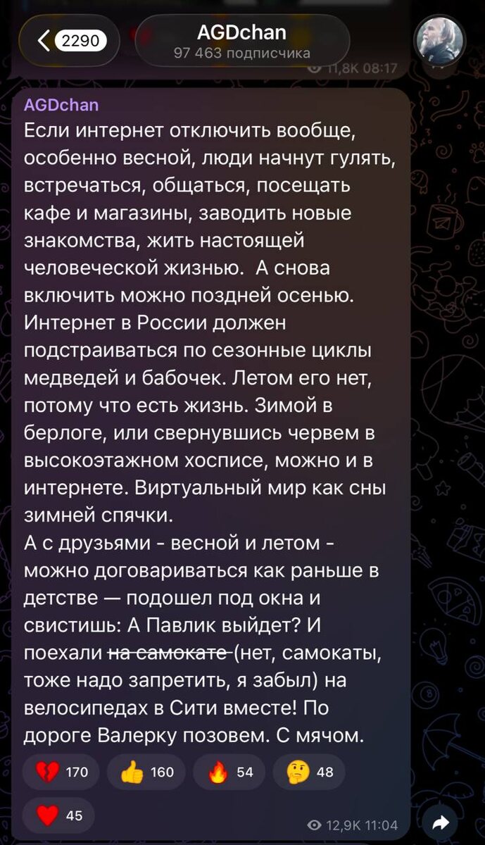 По его словам, включать сеть обратно стоит только поздней осенью, тогда люди будут больше гулять, ходить в кафе и магазины и заводить новые знакомства. Дугин предлагает подстраивать интернет под «сезонные циклы медведей и бабочек»: летом его не должно быть, потому что «есть жизнь», а зимой, «в берлоге», можно возвращаться в онлайн. Инициативы, которые мы заслужили. CtrlAltDelights- подписаться