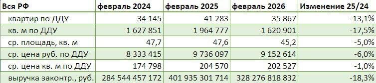 : Результаты реализации квартир в новостройках по ДДУ по всей РФ за февраль 2026 года. По сравнению с февралем 2025 года реализация ниже на 13,1% в лотах, на 17,5% в квадратных метрах и на 18,3% по оценке законтрактованной выручки (включает как поступившие денежные средства, так и денежные средства, которые согласно ДДУ поступят от покупателя в будущем). При этом средние цены кв.м заявленные в ДДУ на 1,0% ниже уровня февраля прошлого года. Средняя площадь реализованной квартиры снизилась на 5,0%, что обусловило и снижение средней цены реализованного лота на 6,0%.