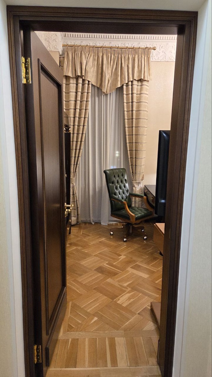 Высокие потолки, хрустальные люстры, рабочая зона с креслом, столом, обитым кожей, книжный шкаф, зона для переговоров с торшером. Так и видишь, как тут когда-то велись тайные заговоры и строились планы на «пятилетки». Есть конечно большой телевизор и минибар с напитками и закусками. Как говорится, протокол обязывает. #hilton