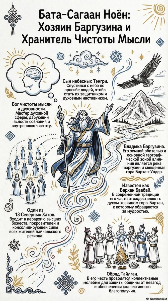 ! ✨ Этот небесный наставник и защитник, сын Тенгри, спустился на землю по просьбе людей, чтобы стать их духовным проводником. Ключевые факты о божестве: 🔺 Сфера влияния: Духовность. Бата-Сагаан Ноён дарует ясность сознания и внутреннюю чистоту. 🔺 Место в иерархии: Он является одним из 13 Северных Хатов, объединяющих жителей всего Байкальского региона. 🔺 Земная обитель: Его владения простираются от реки Баргузин до священной горы Бархан-Ундар. Многим он известен как Бархан Баабай — дух-хозяин горы Бархан, к которому обращаются за мудростью. 🔺 Почитание: В его честь проводят обряд Тайлган — коллективные молебны для защиты общины от невзгод и обеспечения общего благополучия. Канал нашей студии https://dzen.ru/id/670c7fe545d6d72caa724e37