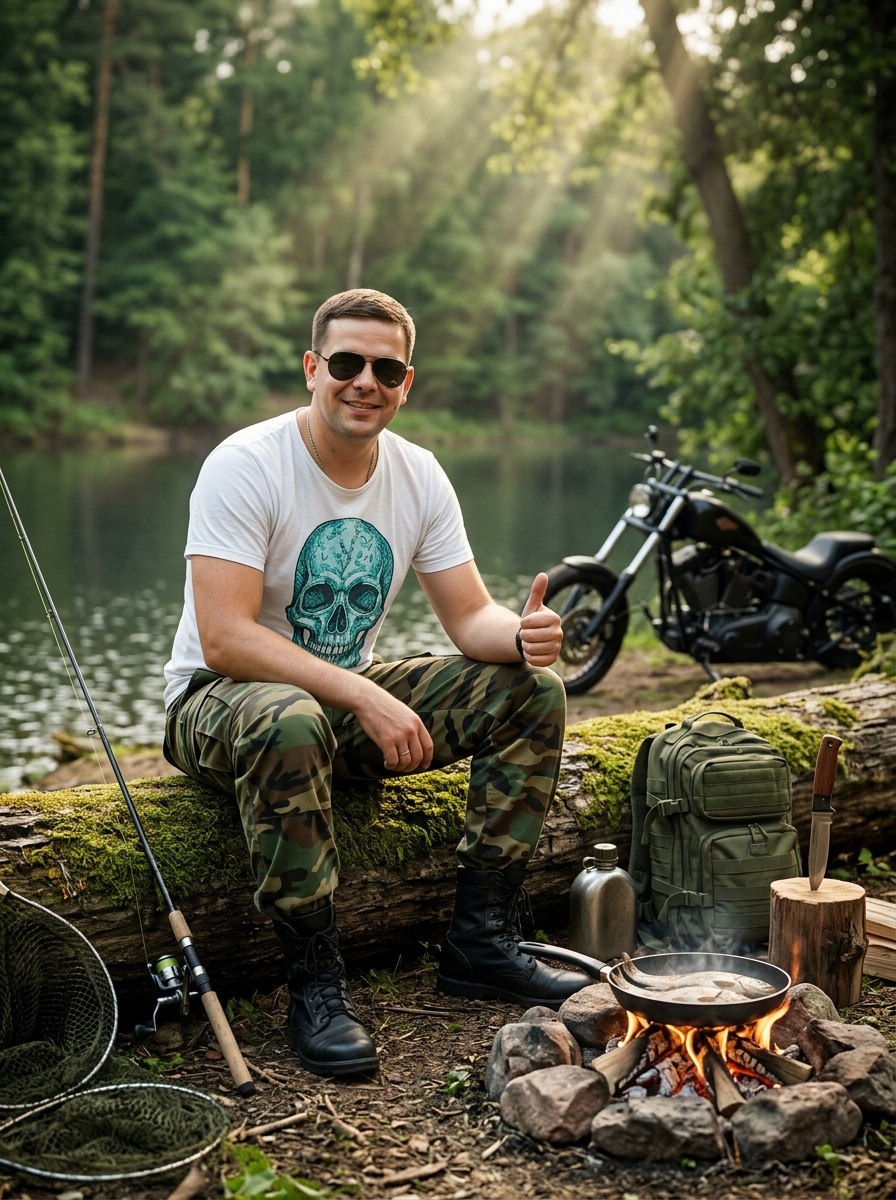 🤖Генерировать можно здесь: 👉БОТ ДЛЯ ГЕНЕРАЦИИ Режим Nano Banana 2/Pro ИНСТРУКЦИЯ Сверхреалистичная фотография в кинематографическом стиле. На переднем плане уверенный молодой мужчина с референсного фото в модных солнцезащитных очках, сидит на большом замшелом бревне у воды. Он одет в белую футболку с принтом черепа бирюзового цвета, камуфляжные брюки, чёрные армейские ботинки. Мужчина смотрит прямо в камеру с дружелюбной улыбкой и показывает жест «класс» большим пальцем. Рядом с ним на берегу разведён небольшой костёр из камней, на котором в сковороде жарится рыба. Вокруг костра расположены элементы кемпинга: зелёный рюкзак, металлическая фляга, нож в деревянной колоде и рыболовная сеть. Слева от мужчины прислонена удочка. На заднем плане, среди деревьев у кромки воды, припаркован чёрный мотоцикл в стиле чоппер. Фон представляет собой спокойное озеро или реку, окружённую густым зелёным лесом. Освещение тёплое и атмосферное, с яркими лучами солнца, пробивающимися сквозь листву деревье