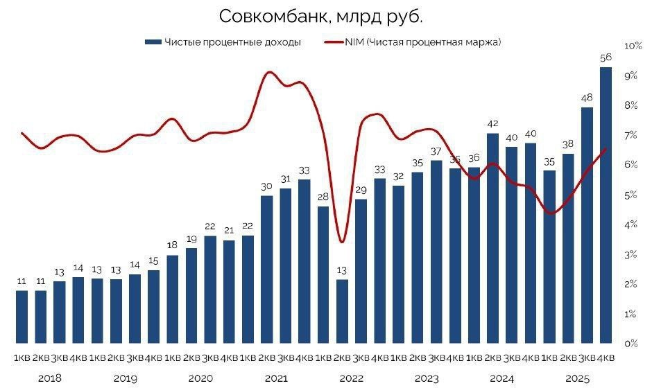 ? Вышедший на прошлой неделе отчет могу немного огорчить на первый взгляд — чистая прибыль получилась ниже ожиданий (ждали 56,7 млрд, факт – 53,2 млрд) из-за начислений по портфелю гарантий. Текущие мультипликаторы банка не выглядят привлекательными, если не ждать роста прибыли в 2026 году. Однако банк показал, что во II пол. 2025 г. вышел на хороший трек — 23 млрд руб. доналоговой прибыли и нарастил чистую процентную маржу на 40% (с 4,6% до 6,5%). В 2026 году ждем продолжения улучшений и по итогу года ориентируемся на 80 млрд руб. чистой прибыли. А вот уже в этом случае форвардные мультипликаторы уже выглядят интересно: P/E ~ 3,8x и P/B ~ 0,67x при ROE ~ 20%. Только, коллеги, Совкомбанк, конечно, более рискованная ставка (чем, к примеру, Сбер) на восстановление и дальнейший рост прибыли. Но у него есть еще один дополнительный драйвер — IPO РТС (скоро расскажем подробнее, что это за компания). 💬 Telegram | 📺YouTube|💰Private-чат
