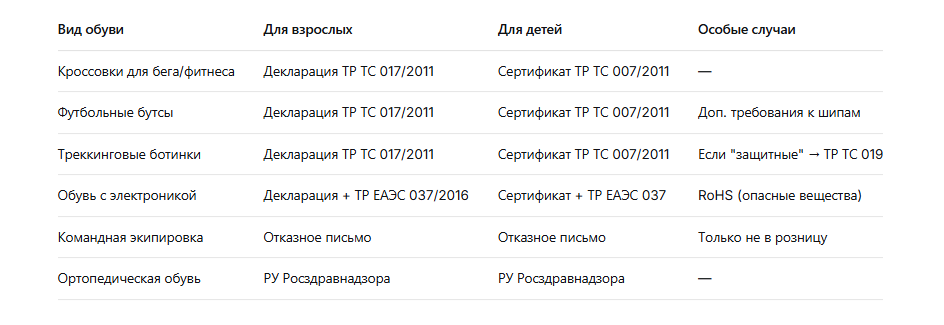 Для ФТС и Роспотребнадзора решающим фактором является невозможность повседневного ношения. Если конструкция обуви жестко привязана к спортивному снаряду или покрытию (шипы, клипсы, специфическая колодка), она выходит из-под действия "текстильного" регламента ТР ТС 017/2011.