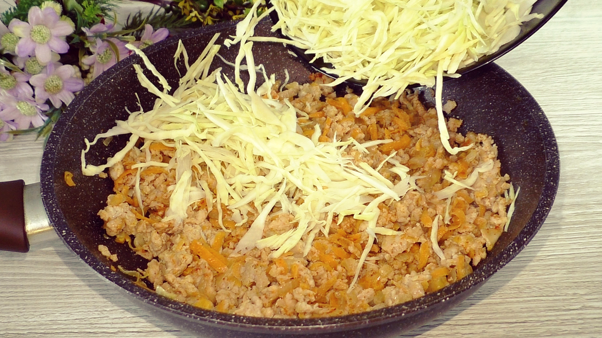 Сейчас я просто обжариваю капусту с фаршем и заливаю тестом. Готовлю заливной пирог на сковороде, получается очень вкусно. Начинка может быть любая по вашему вкусу.
