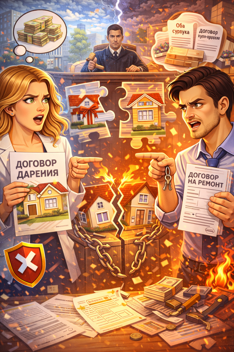 По закону имущество, полученное в дар, считается личной собственностью супруга. Это прямо следует из ст. 36 Семейного кодекса РФ. Но в судебной практике периодически возникают дела, которые для многих становятся полной неожиданностью. Потому что оказывается: даже подаренная квартира иногда становится предметом спора. Разберёмся, когда такое возможно. Это самая распространённая история. Например: родители дарят квартиру молодой семье и говорят: — «Живите, это вам на свадьбу». Но в договоре дарения написано: одаряемые: муж и жена. Юридически это означает, что квартира становится их общей долевой собственностью. И при разводе она делится как обычное имущество. Такие споры регулярно рассматриваются судами. Иногда дарение оформляют только на бумаге. Например: Если в суде будет доказано, что это была фактически купля-про