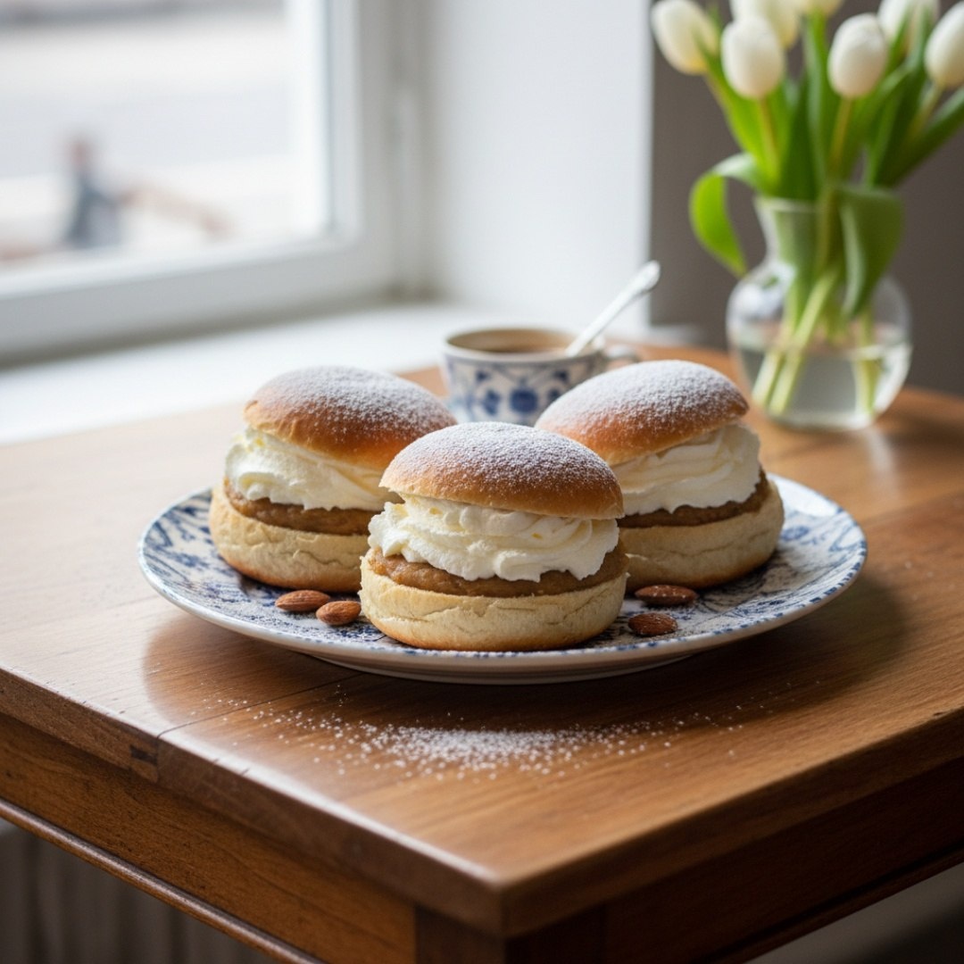 Ингредиенты⤵️ 🔸Мука — 500 г 🔸Молоко тёплое — 250 мл 🔸Дрожжи свежие — 25 г (или 7 г сухих) 🔸Сахар — 180 г 🔸Сливочное масло — 75 г (мягкое) 🔸Яйцо — 2 шт. 🔸Кардамон молотый — 1,5 ч.л. 🔸Соль — ½ ч.л. 🔸Миндаль — 150 г 🔸Молоко — 80–100 мл 🔸Сливки 33–35% — 300 мл 🔸Сахарная пудра — 2 ст.л. Приготовление🥐 1. Приготовить дрожжевое тесто из молока, муки, сахара, кардамона, яйца и масла. Дать подойти 1,5–2 часа. 2. Разделить на 12–16 частей, сформовать булочки. Дать расстояться 40–60 минут. 3. Смазать яйцом, выпекать при 220°C 8–12 минут. Остудить. 4. Измельчить миндаль, смешать с сахаром и молоком в однородную пасту. 5. Срезать у булочек верхушки, удалить мякиш, смешать его с миндальной пастой, наполнить булочки. 6. Взбить сливки с пудрой, отсадить поверх начинки, накрыть крышечкой, посыпать пудрой. Рецепт дня #семла #шведские_булочки #миндаль #сливки #выпечка #десерт