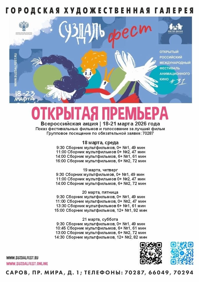 С 18 по 21 марта в Художественной галерее саровчане смогут посмотреть 46 анимационных фильмов. Они разделены на 6 программ по возрастным группам. Участники кинопоказов смогут проголосовать за любой понравившийся фильм. Голоса саровчан учтут при подведении итогов фестиваля на приз зрительских симпатий. Вход на фестивальные кинопоказы бесплатный, групповое посещение - по предварительной заявке: 70287, 66409