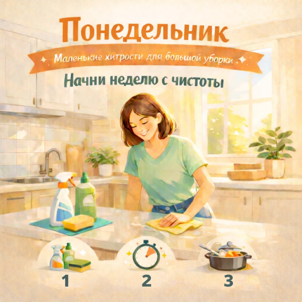 Начните неделю с ощущения порядка и контроля над домом. Иногда достаточно всего нескольких простых привычек, чтобы уборка перестала казаться большой задачей. 🧽 3 лайфхака для быстрого старта: 🧴 Чистящие средства под рукой Держите универсальное средство и губку там, где ими удобно воспользоваться. Когда всё рядом — убрать что-то быстро становится намного легче. ⏱️ Правило 2 минут Если задача занимает меньше двух минут — сделайте её сразу. Протереть раковину, убрать чашку или быстро пропылесосить коврик — такие мелочи не дадут беспорядку накапливаться. 🍲 Уборка во время готовки Пока варится суп или кипит чайник, используйте эти несколько минут: протрите столешницу, уберите лишнее со стола или помойте пару тарелок. 💬 А какие маленькие хитрости используете вы? Делитесь своими советами в комментариях 👇