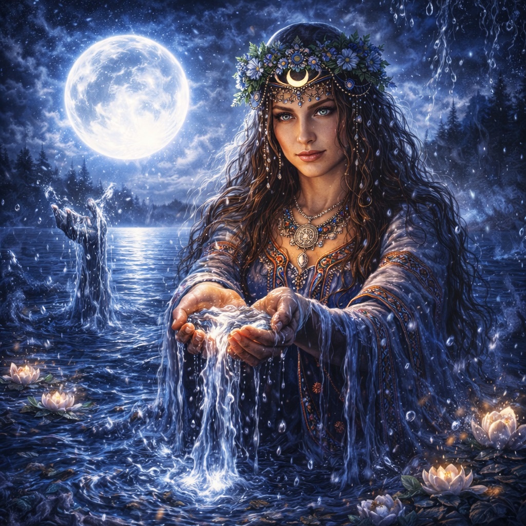 Если нужно выразить эту тему коротко, то лучше всего так: вода — это земной лик Макоши, а луна — её возможное небесное отражение. Вода у неё плотная, телесная, плодородная, «мокрая» по самому имени. Луна — более тонкая, более реконструируемая, но очень логичная надстройка над этим образом.