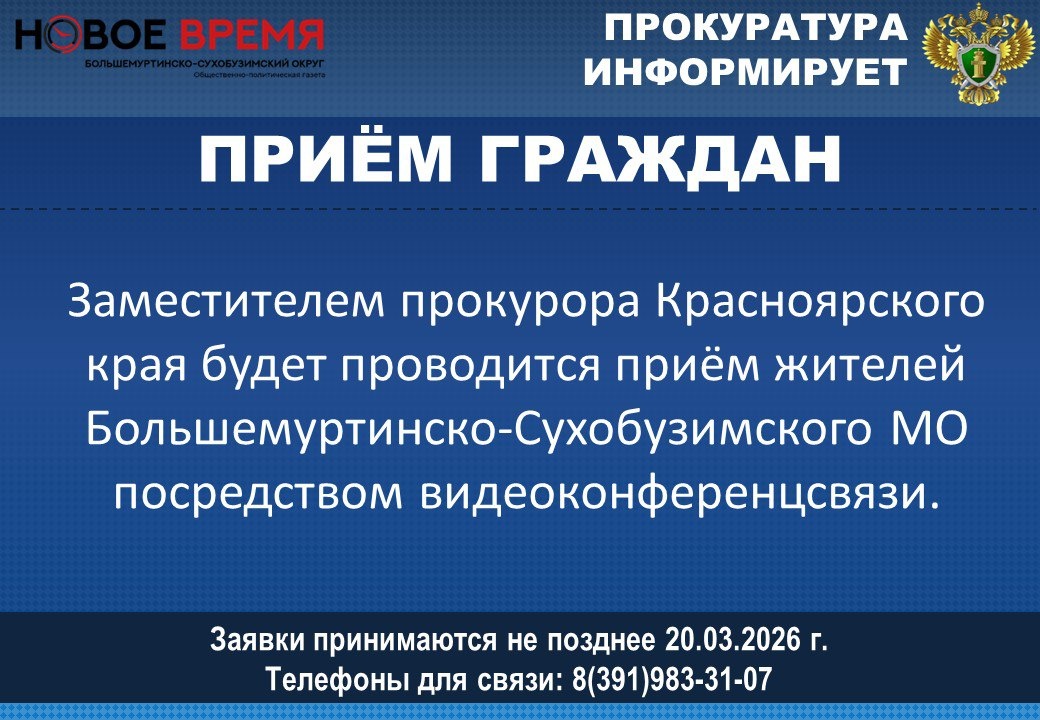 Заместителем прокурора Красноярского края будет проводится прием жителей Большемуртинско-Сухобузимского муниципального