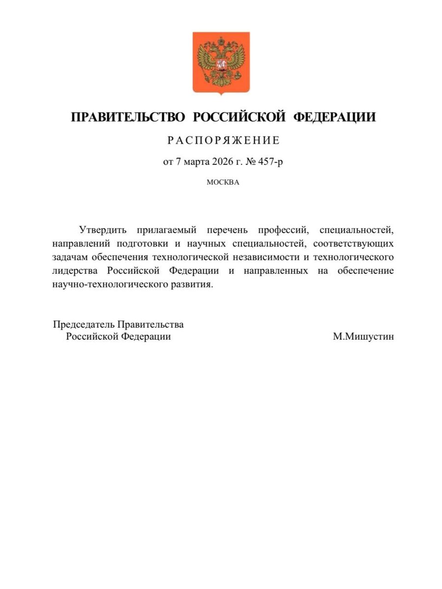 ❗️Правительство утвердило перечень профессий и специальностей, развитие которых станет фундаментом для достижения технологической независимости и технологического лидерства России. ➡️Перечень, утвержденный распоряжением от 7 марта, включает более 500 профессий и специальностей. Это направления средней и высшей профессиональной подготовки, а также бакалавриата, магистратуры, специалитета и ординатуры. ➡️В их числе: информатика, вычислительная техника, электроника, наноэлектроника, радиотехника, криптография, фотоника, биотехнические системы, ядерная энергетика, авиационная и ракетно-космическая техника, мехатроника, робототехника, медицина, фармацевтика и другие ключевые отрасли. ➡️Одновременно определено около 400 приоритетных научных специальностей, направленных на инновационное развитие страны. ➡️Утвержденный перечень ляжет в основу модернизации образовательных программ колледжей и вузов, чтобы выпускники обладали актуальными знаниями, соответствующими вызовам и потребностям рынк