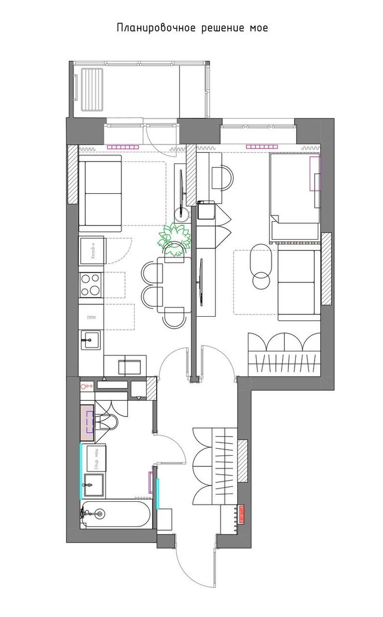 ⬇️⬇️⬇️ Шкаф в прихожей всегда глубиной 60 см. Меньше - только в крайних случаях. Крючки за шкафом, чтобы уменьшить визуальный шум. Унитаз в линию с раковиной. Над самой раковиной будет только зеркало. Хранения в санузле получилось достаточно. Кухню полностью переиграли. Невстроенная СВЧ расположилась на столешнице. Стол получился комфортнее и подход к диванчику стал свободнее. От шведской стенки клиенты отказались. Кровать расположилась изголовьем к перегородке. В дизайне интерьера есть общие рекомендации и те, которые важно совместить с индивидуальными привычками, поэтому подготовка проекта происходит в тесном контакте с клиентами. И меня удивил тот факт, что предыдущий дизайнер не обсудил свои решения с клиентом, ориентируясь только на фотоподборку 🤦♀️ Квартиру точно такой же планировки я разрабатывала около года назад. И в ней мы разделили ванную и санузел, а также перенесли проем в жилую комнату. Ознакомиться с проектом можно в закрепленном посте.