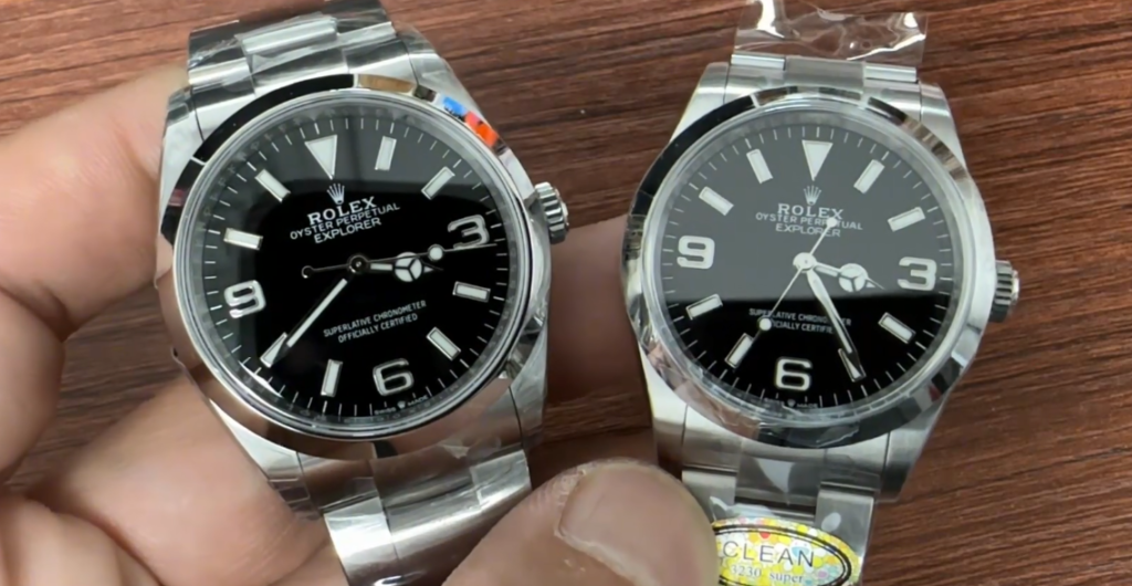 В 2024 году VS выпустила реплику Explorer I 124270. Эти часы впервые появились на рынке с культовым механизмом DD3235, разработанным VS, позже фабрика разработала механизм 3230 для Explorer и Oyster Perpetual. Когда VS впервые выпустила Explorer 124270, у часов были два существенных недостатка: во-первых, на платине механизма была выгравирована надпись «3235», а не «3230». Во-вторых, ширина браслета одинакова от края до края, что не соответствует оригиналу. На следующих фотографиях показана разница в браслетах Explorer 124270 между VS и Clean. Часы слева — от VS, справа — от Clean. У Explorer от Clean браслет намного уже, что ближе к оригиналу, в то время как у Explorer от VS слева браслет выглядит намного шире, что не очень хорошо. Абсолютно точно, это старая версия до внесения улучшений. На следующих фотографиях показаны размеры браслета часов после его усовершенствования. После доработки браслет выглядит намного лучше. Он шире на конце, соединяющемся с корпусом, и сужается к концу,