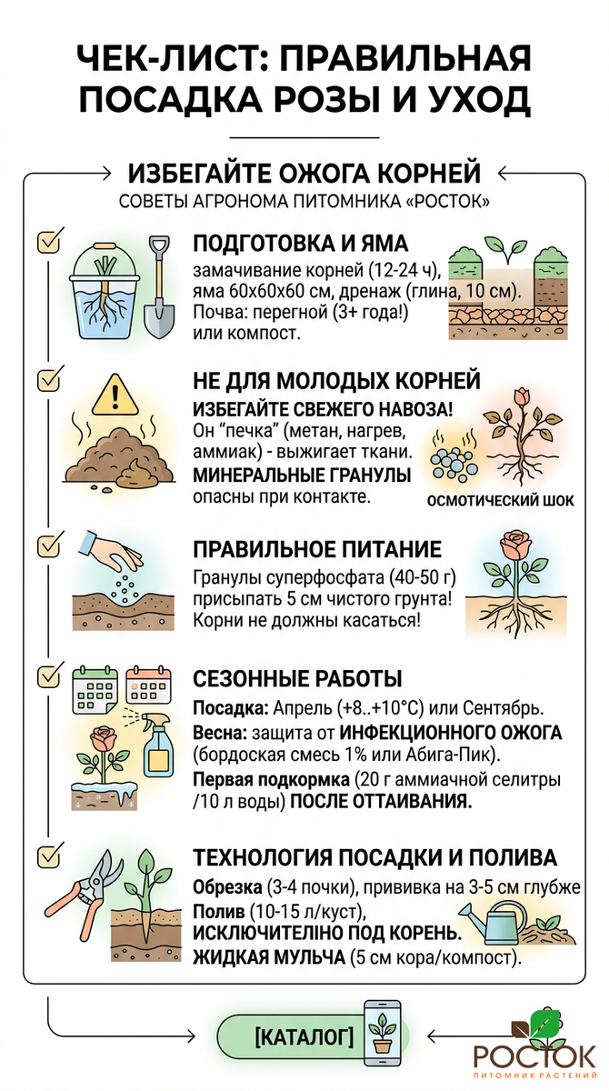 Всем привет! С вами Алёна, специалист по растениям питомника «Росток». Часто ко мне приходят расстроенные садоводы: «Алёна, купила у вас красавицу-розу, посадила в самую лучшую землю, даже навоза не пожалела, а она почернела за неделю!». Начинаем разбираться — и сердце кровью обливается. Оказывается, хозяйка так хотела «накормить» кустик, что устроила ему настоящую химическую атаку. Давайте разберем, почему наши благие намерения иногда превращаются в яд для растений. Самая коварная ошибка — свежий навоз в посадочной яме. Друзья, запомните: это не еда, это «печка»! При разложении навоз выделяет метан и так сильно нагревается, что буквально заваривает нежные корешки, как кипяток. А концентрированный аммиак просто выжигает ткани. Минеральные гранулы не менее опасны при прямом контакте. У саженцев с открытой корневой системой (ОКС) нет защиты, и соли начинают вытягивать из корней влагу. Это называется осмотический шок. Роза — дама нежная, ей нужен уютный рыхлый грунт, а не солевое бо