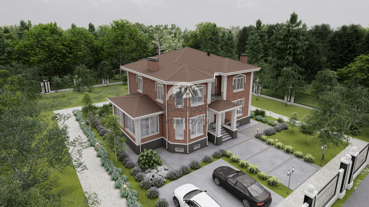 Номер проекта: 107-59 (П94) Разделы проекта: Архитектурный и Конструктивный разделы Узнать о проекте больше можно на сайте evastroy.ru или по телефону +7 (495) 175-30-40 С крыльца (3 м2) заходим в тамбур (6,6 м2), в нем гардеробный шкаф и вход в бойлерную (11 м2). Двустворчатая дверь из тамбура ведет в холл, который является частью открытой дневной зоны, куда также входит гостиная (28 м2) и кухня-столовая (28 м2). Из кухни-столовой можно пройти в остекленный зимний сад (17 м2), отдохнуть перед камином или большим окном. Из гостиной же через отдельный тамбур (9 м2) можно выйти на крытое крыльцо (8 м2) с полукруглыми ступенями. Второе эркерное помещение — гостевая спальня (15 м2). Также в планировку этажа включен санузел (8.6 м2) и межэтажная лестница. Наверху расположены четыре спальни, общий санузел (4 м2) и холл (18,5 м2) с выходом на общий балкон (2 м2). В состав мастер-спальни входит: Остальные три спальни также имеют собственные отличия. Так, к спальне 13 м2 прилагается гардеробная