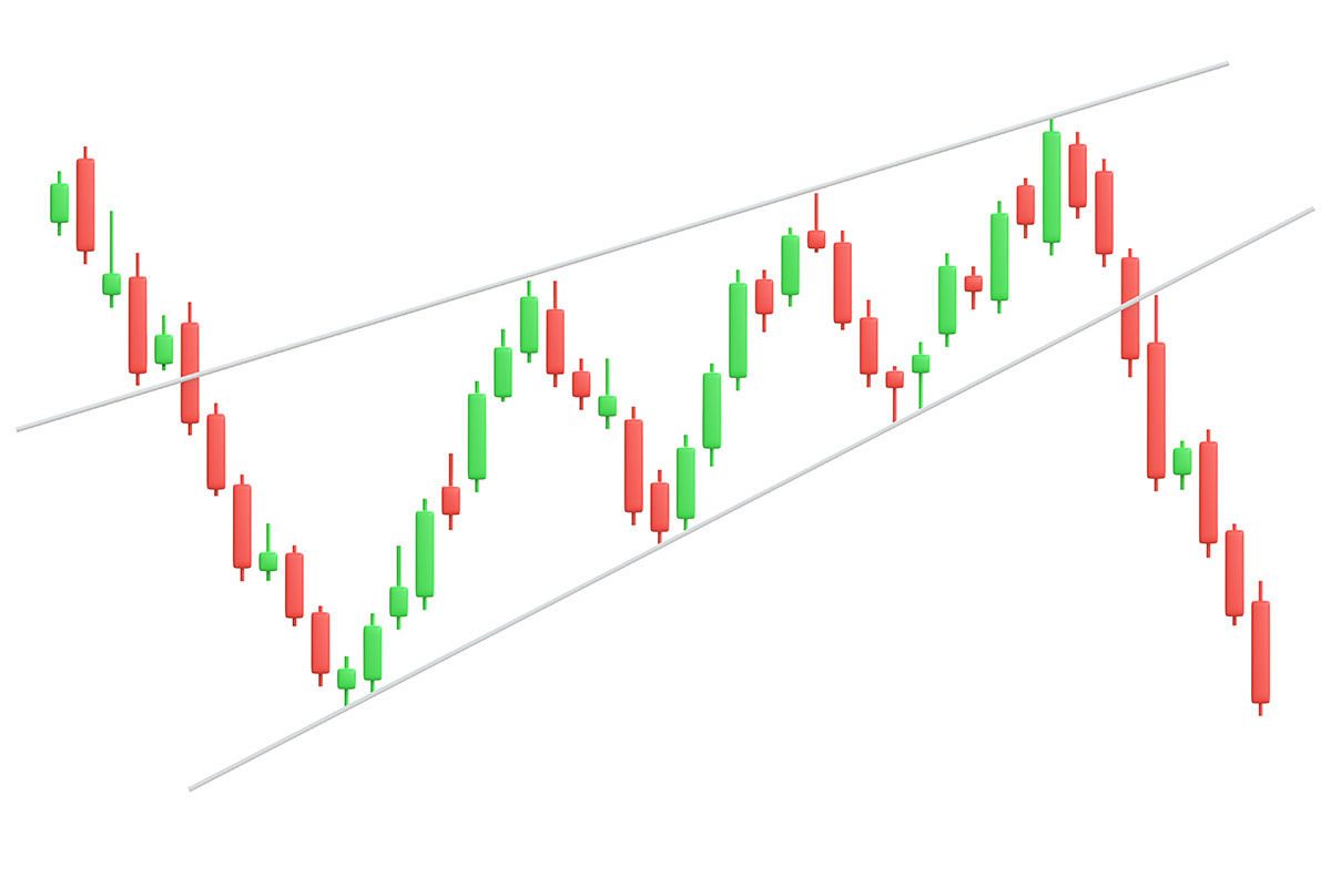 Для восходящего клина алгоритм зеркальный. Ждем пробоя нижней границы вниз, подтверждения объемами и открываем короткую позицию. Цель рассчитываем аналогично, откладывая высоту фигуры вниз.