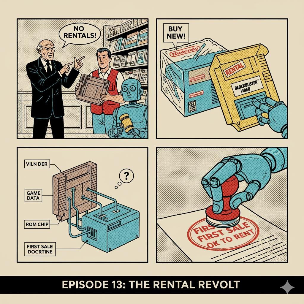 💻 САГА О ПИКСЕЛЯХ И ПАТЕНТАХ Часть 13. Nintendo of America, Inc. v. Blockbuster Entertainment Corp. (1989): Война за прокат и доктрина первой продажи. Этот конфликт разгорелся вокруг новой и чрезвычайно прибыльной бизнес-модели — проката видеоигр — и стал проверкой на прочность одного из фундаментальных принципов авторского права, доктрины первой продажи. 🙅♂️ Прелюдия: В конце 1980-х годов, на пике популярности Nintendo Entertainment System (NES), сети видеопроката, такие как Blockbuster, начали сдавать в аренду игровые картриджи. Эта практика была законной в США благодаря доктрине первой продажи, которая позволяет законному владельцу копии произведения продавать или иным образом распоряжаться этой копией без разрешения правообладателя. Nintendo, однако, считала, что прокат наносит ущерб продажам и обесценивает их продукцию. 😡 Конфликт: Не сумев добиться законодательного запрета на прокат игр (в отличие от музыкальной индустрии и индустрии ПО для ПК, которые добились таки