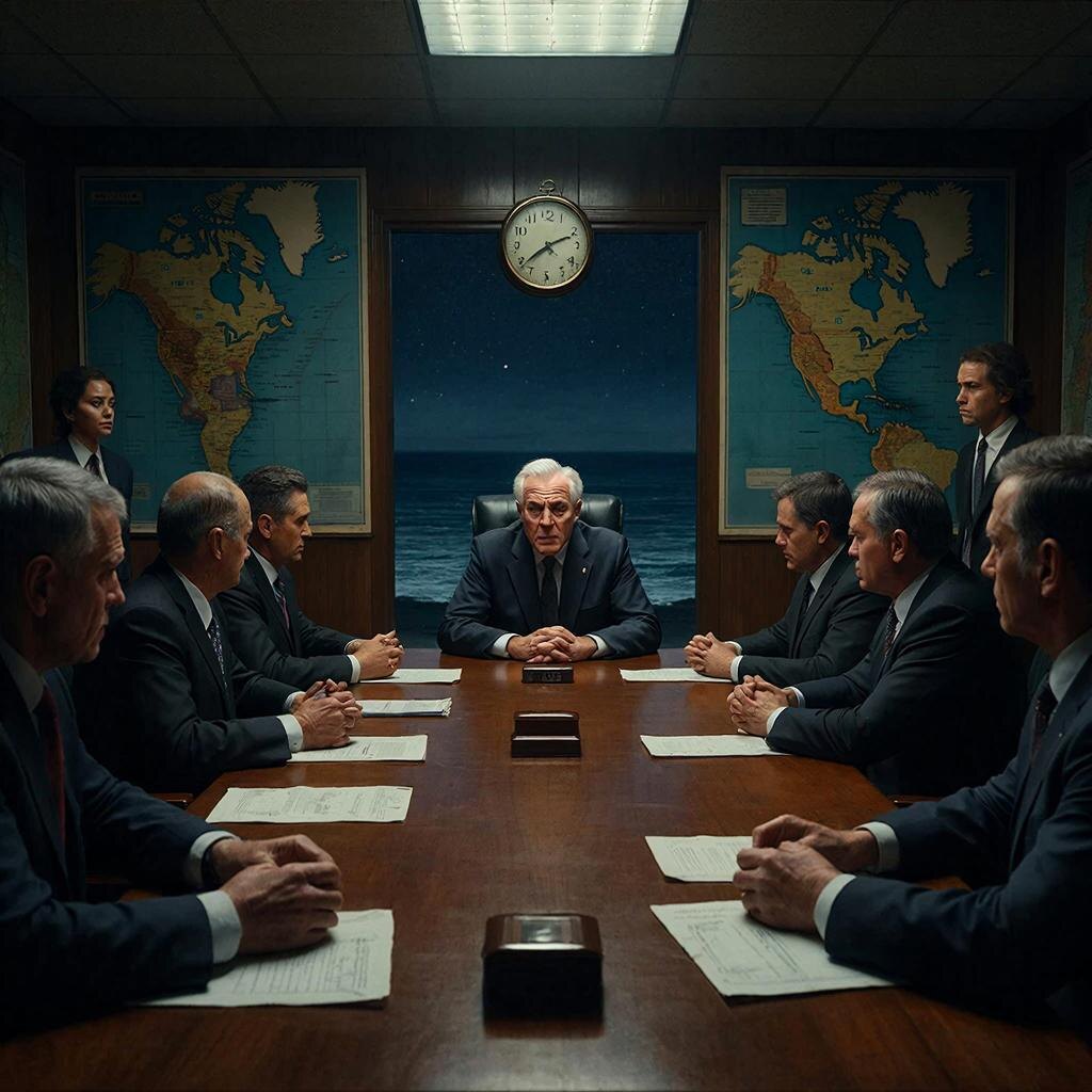 Сэр Питер Уэст, старший посол по должности и по возрасту, сидел во главе стола. Пятьдесят восемь лет, седые виски, тёмный костюм, который он носил уже третьи сутки, не меняя. Перед ним — блокнот с записями, сделанными от руки. Механические часы на запястье тикали, отсчитывая минуты самого долгого совещания в его жизни.