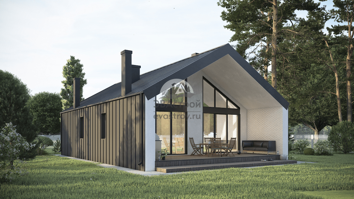 Номер проекта: 107-39 (П96) Разделы проекта: Архитектурный и Конструктивный разделы Узнать о проекте больше можно на сайте evastroy.ru или по телефону +7 (495) 175-30-40 Одноэтажный дом-барнхаус сочетает современную архитектуру с минималистичными фасадами, практичную планировку и комфортные условия проживания. Строение общей площадью 125 м2 и габаритами 9.8 x 15.6 м рассчитано на небольшую семью из двух-трех человек. Состав: 2 спальни, гостиная, кухня, кабинет, 2 санузла, бойлерная, тамбур, холл. Особенности проекта: главная спальня с санузлом и местом для гардероба; просторная крытая терраса; отдельная рабочая зона. Все помещения можно разделить на жилые и хозяйственно-вспомогательные. К жилой части относится гостиная с кухней, обе спальни и кабинет. В гостиной отметим такое эффектное дизайнерское решение, как камин между панорамными окнами; зона отдыха обустроена удобным диваном и ТВ. В открытой кухне — линейный гарнитур и островной обеденный стол. Подсобную часть составляют: тамбур