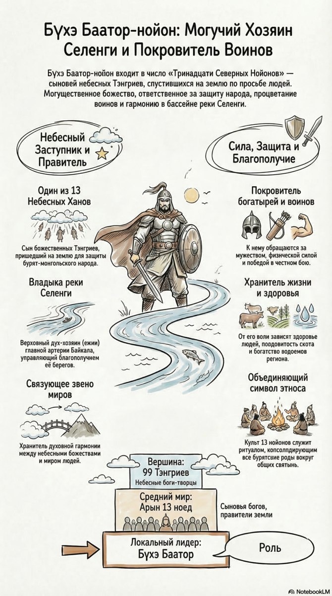 🛡️ Это великое божество, спустившееся на землю по просьбе людей. Его роль и покровительство: 🔹 Небесный Заступник: Один из 13 Ханов, призванных защищать бурят-монгольский народ и его традиции. 🔹 Покровитель Воинов: К нему обращаются за мужеством, физической силой и победой в честном бою. Настоящий дух доблести и чести. 🔹 Хозяин Селенги: Верховный дух-хозяин главной артерии Байкала, отвечающий за гармонию и процветание её берегов. 🔹 Хранитель Благополучия: От его воли зависят здоровье людей, плодовитость скота и богатство водоёмов региона. 🔹 Связующее Звено Миров: Служит хранителем духовной гармонии между небесными богами и миром людей. 🔹 Символ Единства: Культ 13 нойонов — это ритуал, консолидирующий все бурятские роды вокруг общих святынь. В иерархии мира: над ним стоят 99 Тэнгриев, он является правителем Среднего мира, а на локальном уровне — лидером и покровителем. Канал нашей студии https://dzen.ru/id/670c7fe545d6d72caa724e37