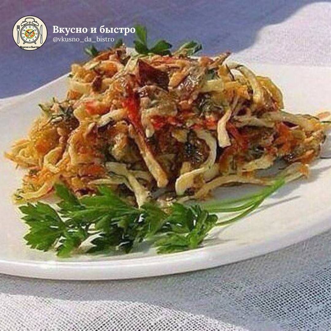 » #салат #30мин 🕒 Время приготовления 30 мин Порции 2-3 Сложность: легко 🧾 Ингредиенты: 🟠Крабовые палочки — 200 г 🟠Шампиньоны — 300 г 🟠Лук — 2 шт. 🟠Морковь (варёная) — 2 шт. 🟠Укроп — 1 пучок 🟠Масло оливковое — 20 мл 🟠Масло растительное — для обжарки 🟠Соль — по вкусу 🍴Приготовление: 1. Лук нарежьте полукольцами и обжарьте на растительном масле до золотистости. 2. Грибы нарежьте пластинками и обжарьте до золотистого цвета. 3. Крабовые палочки нарежьте соломкой и слегка обжарьте на растительном масле. 4. Соедините обжаренные грибы, лук и крабовые палочки. Добавьте отварную морковь, натёртую на крупной тёрке, и мелко нарубленный укроп. 5. Заправьте оливковым маслом и тщательно перемешайте. Вкусно и Быстро | Мы в Мах 📲