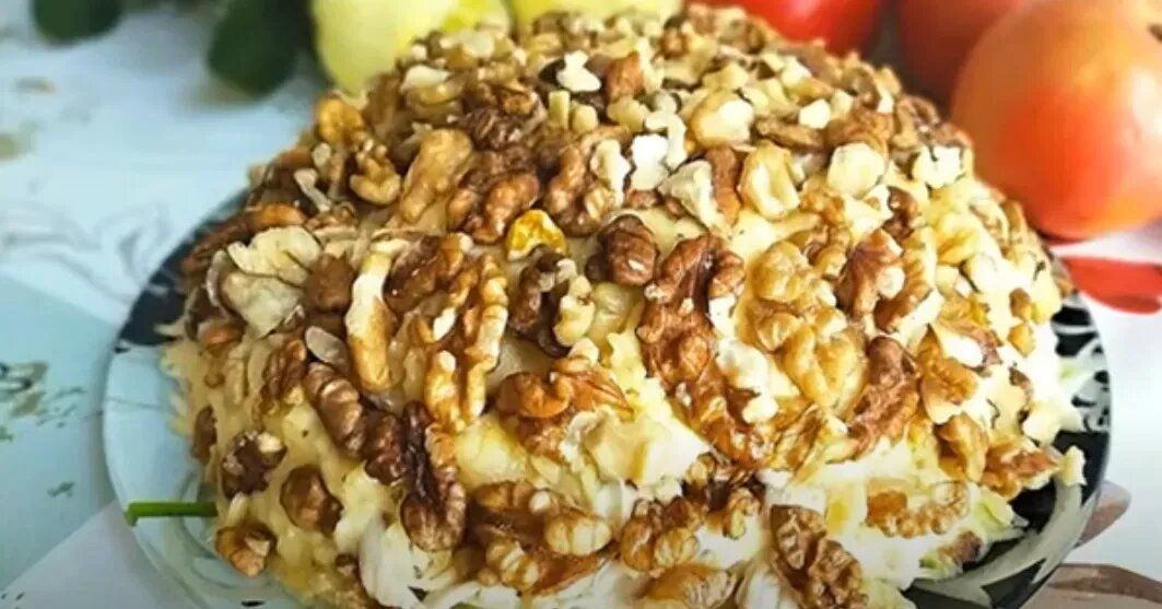 Салат «Чудесный» напоминает «Оливье», но в более интересной интерпретации. В его состав входят грибы и грецкие орехи, которые придают блюду особый вкус.