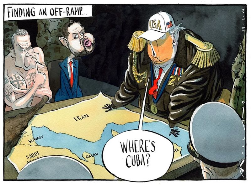 Карикатура из The Sunday Times: «В поисках стратегии выхода… Дональд Трамп: — Где Куба?». Забавно, что художник повесил на грудь Трампу российский флаг и букву Z :)