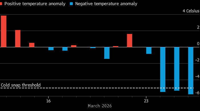 Это может спровоцировать новую волну роста цен на природный газ, которые и так подскочили после начала войны в Иране, предупреждают аналитики BloombergNEF. Прогнозное отклонение температуры в Центральной Европе от среднего десятилетнего показателя. Источник: Bloomberg По прогнозам синоптиков, в конце марта в Центральной Европе ожидается сильное похолодание. Как ожидается, 24–26 марта температура в регионе отклонится вниз от среднего десятилетнего показателя на 5–6 градусов Цельсия. При этом возможно, что холодная погода в Центральной Европе задержится дольше. Реализация такого сценария будет считаться погодной аномалией, пишут эксперты BloombergNEF. Они также отмечают, что экстремальные перепады температуры в регионе не только становятся все более частыми, но и что они все чаще следуют друг за другом, порождая риски масштабных колебаний цен на сырьевые активы. В подобной ситуации многое будет зависеть от возобновляемых источников энергии, однако и этому сектору придётся полагаться на м