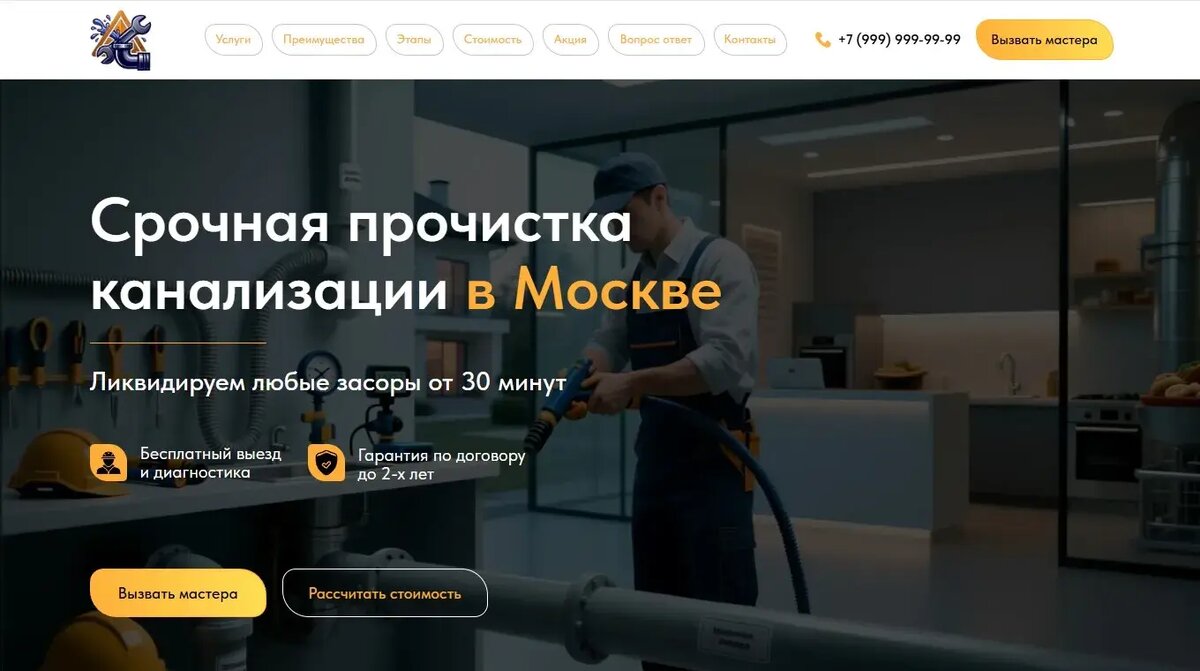 Эффективный одностраничный шаблон для сайта услуг по устранению засоров и обслуживанию канализаций. Дизайн ориентирован на быстрое привлечение клиентов: от собственников квартир до владельцев ресторанов.