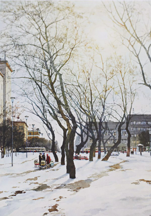 Но какой же он сухач, когда писал такие живые, легкие акварели: городские виды, наполненные людьми, человеческим присутствием. Он словно поднимался над суетой, чтобы охватить взглядом проспекты, площади и крыши, чтобы показать сколько красоты в обычных днях.