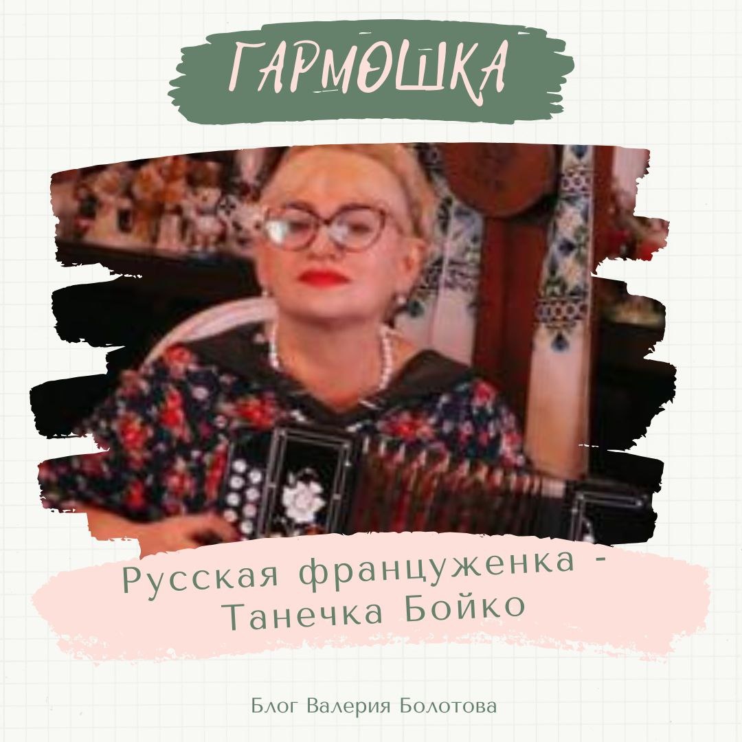 Владимир Торопов Сегодня я хочу похвалиться перед вами, дорогие читатели, знакомством с одной замечательной женщиной – гармонисткой из Смоленска – Танечкой Бойко. Я впервые увидел её на фестивале «Русская гармонь в Крыму» у Александра Ганичева. В холле дома культуры сидела яркая и очень привлекательная женщина и пела песню на французском – «Падает снег» из репертуара Сальваторе Адамо. Первое, что меня удивило, когда я подошел ближе, то, что рисунок на ее концертном платье был точно такой же, что и рисунок меха на гармони. Я, честно говоря, опешил и про себя сказал: высший пилотаж! Потом же, просто заслушался ее прекрасным голосом и пением. Песня закончилась, я подошел к ней и мы познакомились. Как оказалось, она закончила Педагогический институт, французское отделение, и вот теперь осваивает гармошку и иногда поет на французском.