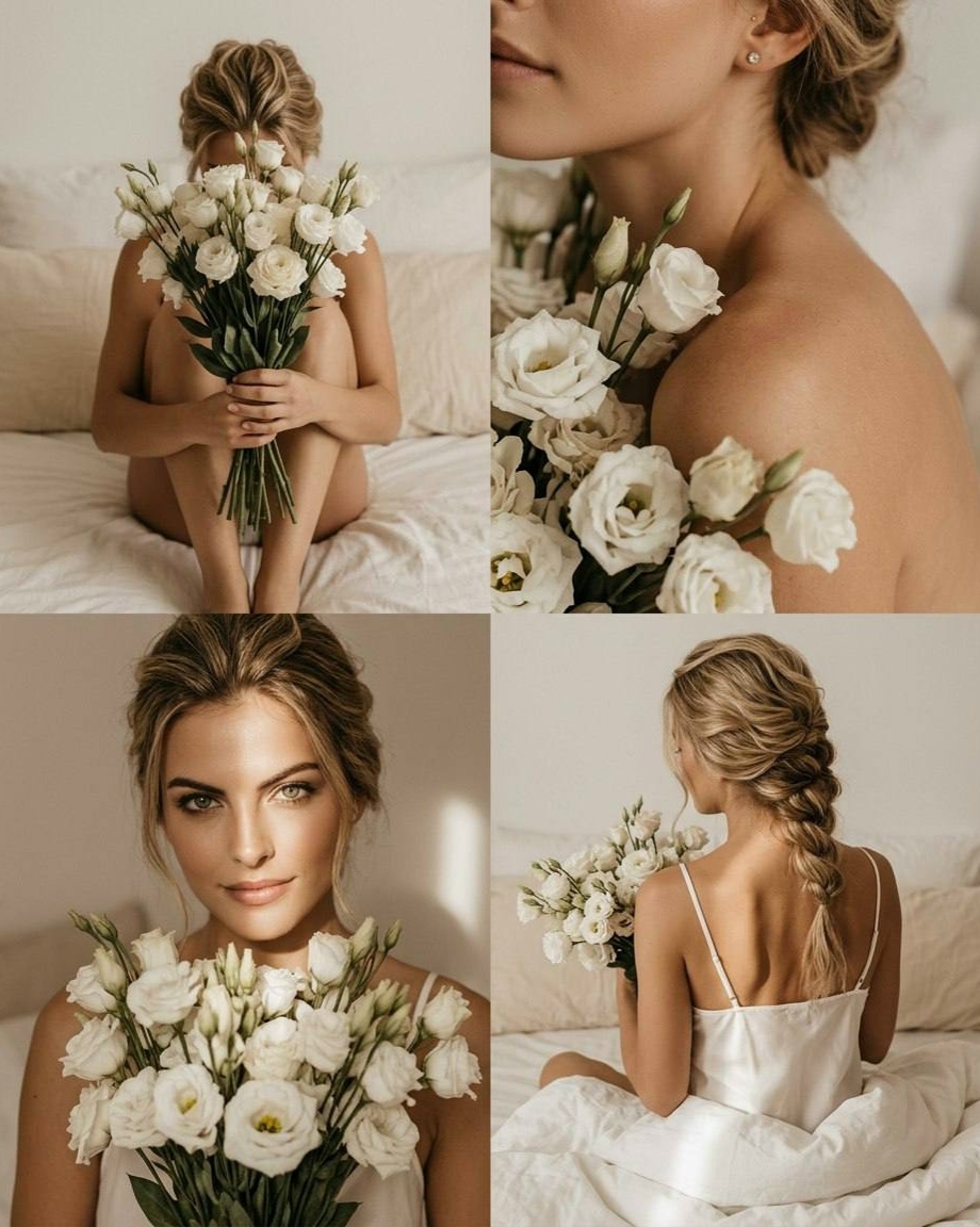 Верхний левый: Я сижу на кровати, обняв колени, лицо скрыто за большим букетом белых цветов (эустома/розы). Видна только причесанная голова.