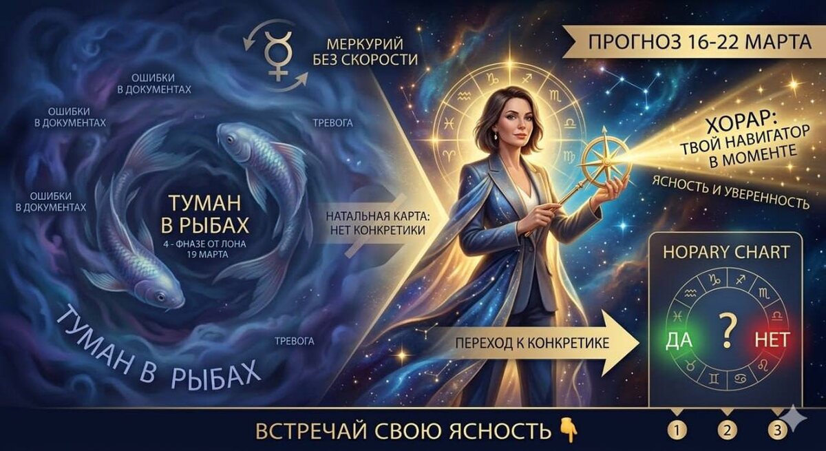 🌪✨ Мои хорошие, пристегните ремни. Мы входим в самую странную, вязкую, но судьбоносную неделю марта. На небе происходит настоящий «паралич» перед грандиозным стартом. Что происходит? 📍 До 19.03 4-я фаза Луны. Сил нет, энергия на нуле, хочется замереть и не шевелиться. 📍 Меркурий без скорости. Планета логики и связи буквально «зависла» в знаке Рыб. Это апогей путаницы: ошибки в документах, недопонимания, техника живет своей жизнью. 📍 19.03 Новолуние в Рыбах. Точка максимального тумана, но и зарождение новой мечты. 📍 20.03 Меркурий разворачивается в директ. Ура! Мозг начинает включаться. Что это значит для вас? На этой неделе бесполезно пытаться «пробить стену» головой. Если вы чувствуете, что буксуете это нормально. Сейчас время не для рывков, а для получения точных ответов. КЕЙС: Как работает Хорар в такой «кисель»? 👇 Ко мне вчера обратилась клиентка Вопрос жизни и смерти: «Сорвется ли покупка квартиры? Продавец ведет себя странно, на звонки не отвечает». В обычный период Мер