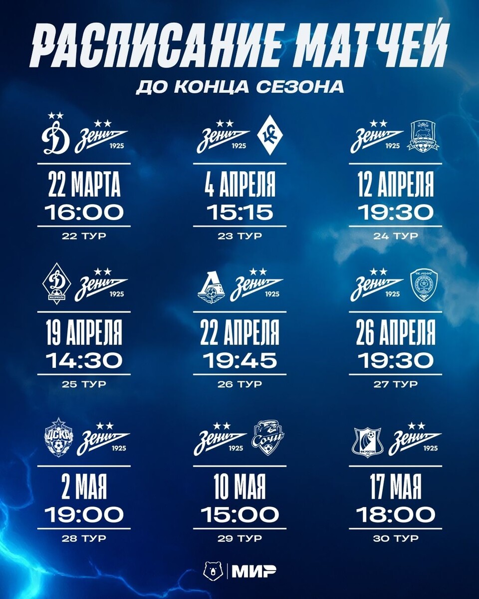 Накануне пресс-служба Мир Российской Премьер-Лиги обнародовала расписание до конца текущего сезона. В частности, стал известен точный график матчей «Зенита». По состоянию на сегодняшний день первое место в турнирной таблице Российской Премьер-Лиги занимает «Краснодар», набравший 46 очков по результатам 21 проведённой встречи. На второй строчке располагается санкт-петербургский «Зенит» (45). Тройку лидеров замыкает московский «Локомотив», который набрал 41 очко в 21 матче. На последнем, 16-м месте находится «Сочи». В активе южан девять очков. 15-ю строчку занимает «Оренбург» с 18 очками. «Пари Нижний Новгород» и самарские «Крылья Советов» располагаются на 13-м и 14-м местах, набрав по 20 очков.