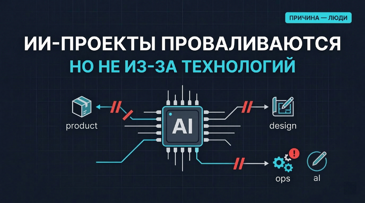 Ты наверняка видел эти бодрые отчёты в духе «мы внедрили ИИ». А потом проходит пару месяцев — и выясняется, что ИИ живёт в красивой презентации, а в реальной работе его обходят стороной, как сломанный принтер в офисе. Обычно всё сводится к двум вечным темам: «модель не такая умная» и «данные плохие». Это бывает, да. Но если смотреть на реальные запуски внутри компаний, самый жирный источник проблем — не технологии. Он в людях и в том, как они между собой договариваются. Типичная картина: инженеры собрали умную штуку, а продакт не понимает куда её пристроить. Дата-сайентисты сделали прототип, а эксплуатация потом страдает — потому что это невозможно нормально поддерживать. Приложение стоит без дела, потому что тех, кому оно должно помогать, никто не спросил что вообще значит «полезно». Корень проблемы простой: когда ИИ понимают только разработчики, остальным остаётся две роли — верить на слово или мешать. Иногда это одно и то же. Продакт не может обсуждать компромиссы, которые не понима