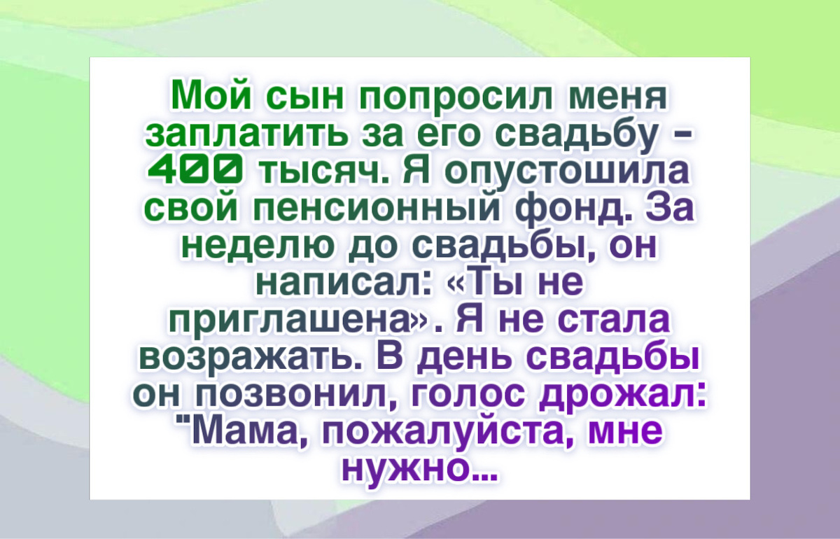 “Однажды мой сын попросил у меня около 3 600 000 рублей на свадьбу. Я отдал почти все свои пенсионные накопления. За неделю до свадьбы пришло сообщение: «Ты не приглашена. Ее семья не хочет тебя видеть». Я не умолял и не спорил. В день свадьбы он позвонил. Голос дрожал. Он сказал: «Мама, мне просто нужно услышать твой голос». Он плакал и говорил, что весь день чувствует себя странно. Я просто сказала, что я рядом. Через две недели он прилетел домой вместе со своей женой. Она обняла меня и сказала, что ей очень жаль. Это было искренне. Я это почувствовал.”