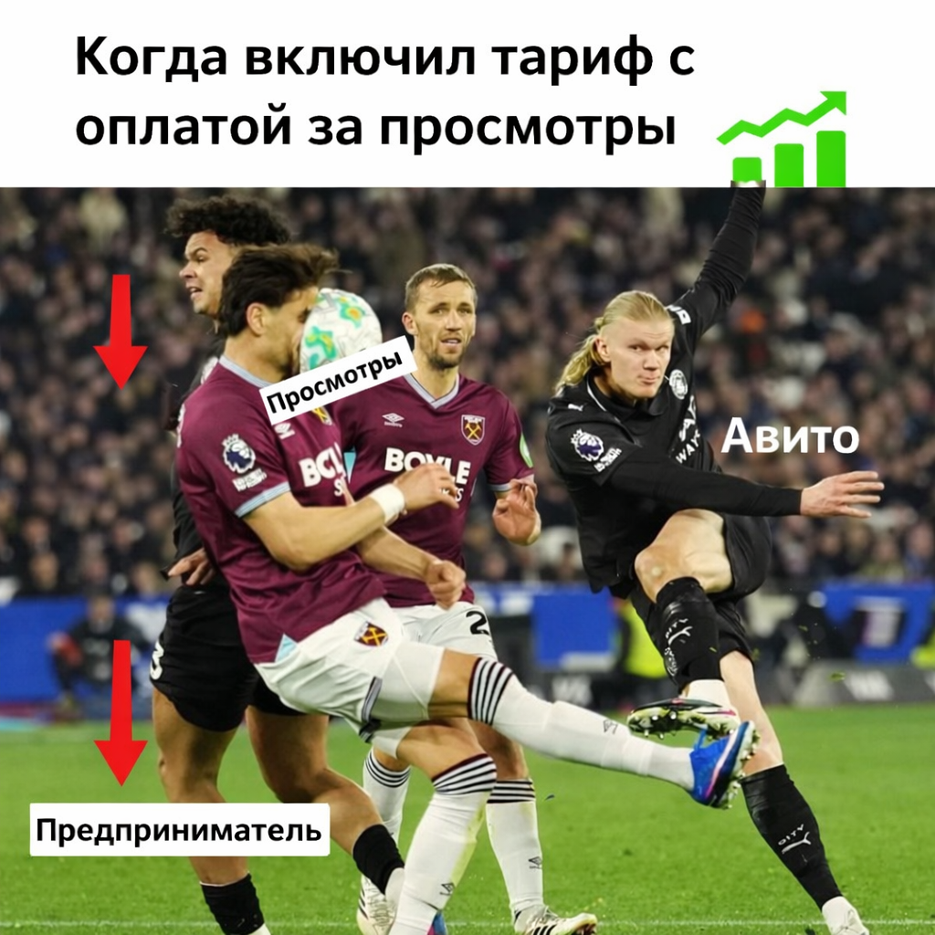На картинке Авито красиво влепляет мячом "просмотров" по предпринимателю. Сцена, прямо скажем, жизненная. Потому что очень многие до сих пор путают движение в статистике с движением денег в кассе.