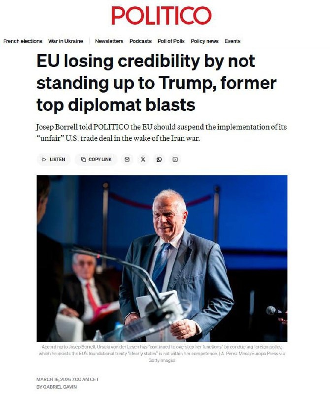 Экс-глава дипломатии ЕС Жозеп Боррель раскритиковал Каю Каллас за некритическое отношение к Америке и призвал к прекращению торговой сделки