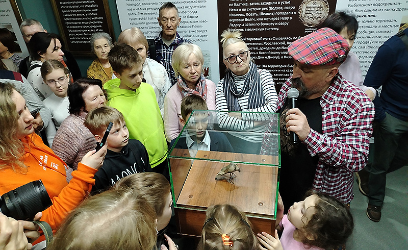 Такого людного открытия музейной выставки даже не припомнить. 14 марта новую экспозицию в Новой бирже — «Викинги. Загадка затопленных территорий» — открывали сотня гостей вместе с реконструкторами и фолк-группой. «Викинги» — это общее дитя Рыбинкого музея-заповедника и частного музея «Рыбинские рыбы». Проект поддержал Фонд президентских грантов. — Этот проект о том, как небольшой предмет может стать началом увлекательной истории, — говорит руководитель музея «Рыбинские рыбы» Алексей Алексашин и подводит к витрине. Через стекло на зрителей смотрят выпученные глаза, вырезанные на небольшом предмете — размером с ладонь. — Мы можем предположить, что это рукоять какого-то предмета, вырезанная из кости. С одной стороны мастер изобразил на ней голову человека, с другой — сокола, — продолжает Алексашин. — Предмет поставил в тупик даже ученых мужей Института материальной культуры РАН. Исследователи, специализирующиеся на эпохе раннего средневековья, до сих пор расходятся во мнении о происхожден