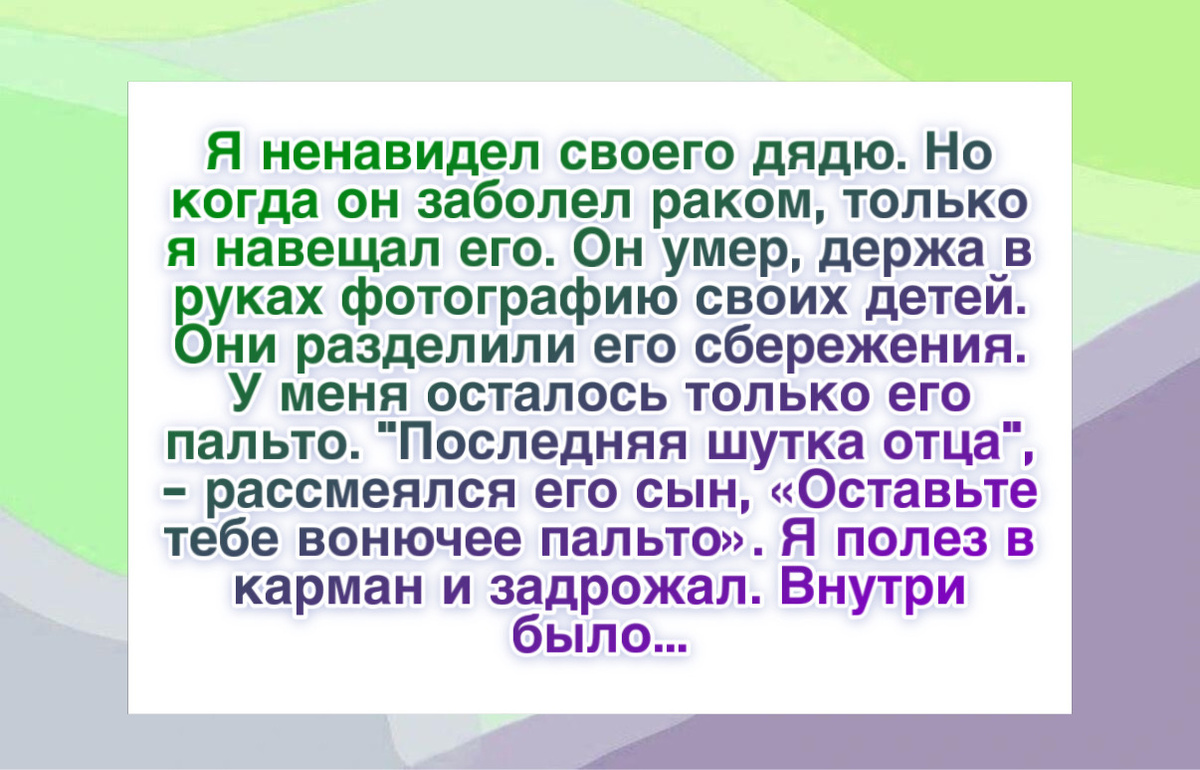 “Я никогда не любил своего дядю. Он был ворчливым и постоянно меня критиковал. Когда у него обнаружили рак, почти никто его не навещал. Я пришел один раз, скорее из чувства долга. После его смерти на оглашении завещания его дети разделили между собой около 3 600 000 рублей. Мне досталось только его старое пальто. Я почти выбросил его, но нащупал в кармане конверт с моим именем и маленький ключ. В письме дядя написал, что его дети будут спорить из за денег. Пусть спорят. Ключ открывает банковскую ячейку. В ней лежали документы на участок стоимостью около 54 000 000 рублей. И строчка, которая меня добила: «Пальто было единственной вещью, из за которой они не стали бы с вами спорить».”