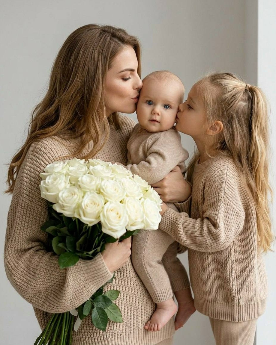 1) Заходим в БОТ ВК или БОТ ТГ 2) Жмем Выбор модели => Nano Banana PRO/Nano Banana 2 3) Добавляем свой фото (важно фото БЕЗ ретуши и любой обработки и фильтров), вставляем этот ПРОМТ: A beautiful young mother with long wavy light brown hair, soft natural makeup, gentle loving expression, wearing an oversized chunky beige knit sweater, tenderly holding a large luxurious bouquet of pure white roses in one arm, kissing her infant baby boy on the cheek while the baby looks at the camera with big curious eyes, the baby dressed in a soft beige knitted onesie, on her other side her adorable little daughter about 5-6 years old with long hair in a ponytail, wearing matching beige knit sweater, sweetly kissing the mother's cheek, all three in a close affectionate group hug pose, neutral minimalist light gray or white studio background, soft diffused natural window light creating warm cozy atmosphere, emotional tender family moment, high detail on faces, realistic skin textures, subtle smiles, ph
