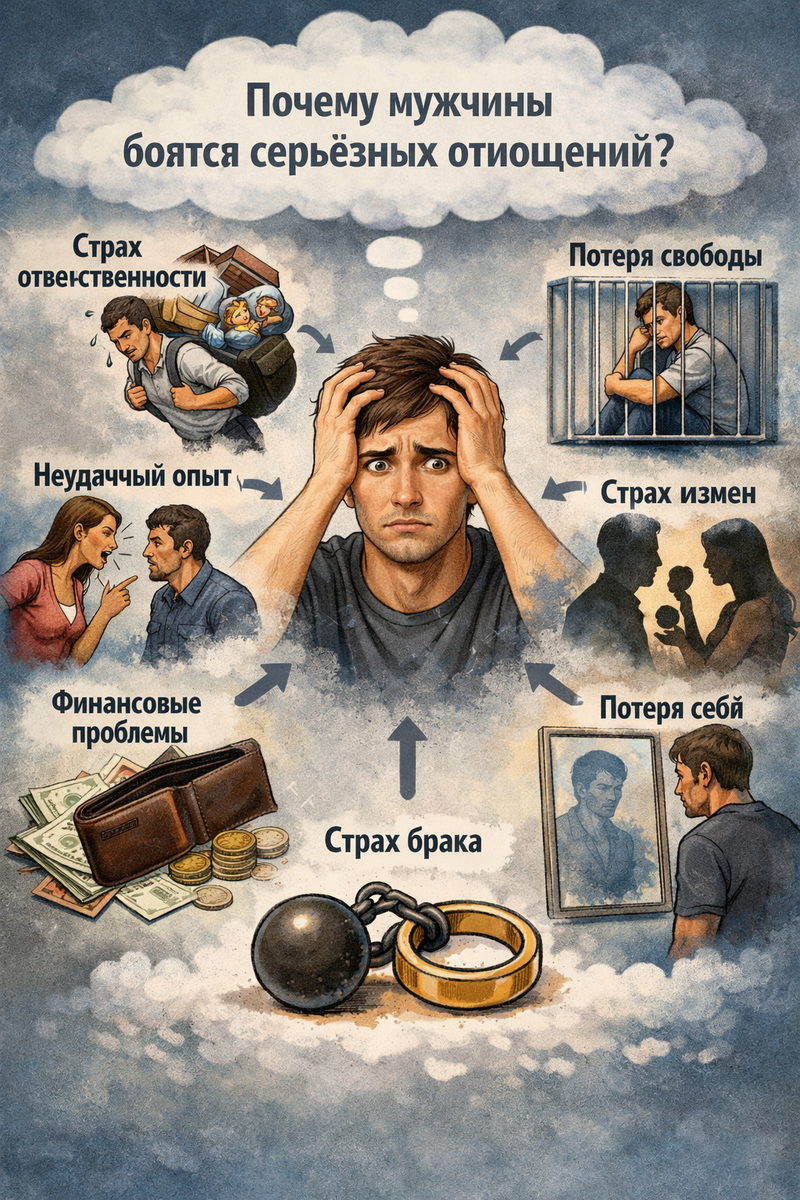 Отношения вроде бы развиваются хорошо: общение приятное, есть интерес, человек проводит время рядом. Но как только разговор заходит о будущем, всё начинает меняться. Мужчина становится осторожным, избегает серьёзных тем или постепенно начинает отдаляться. Со стороны это может выглядеть как нежелание строить отношения. Но на самом деле причины часто оказываются гораздо глубже. Для некоторых мужчин серьёзные отношения ассоциируются с ограничениями. Появляется ощущение, что теперь нужно менять привычный образ жизни, отказываться от каких-то вещей или постоянно учитывать чужие ожидания. Иногда этот страх возникает не из-за самой женщины, а из-за представлений о том, как должна выглядеть семейная жизнь. Прошлые отношения могут сильно влиять на то, как человек относится к новым. Если мужчина пережил болезненное расставание, развод или сложные конфликты, у него может появиться внутреннее убеждение, что серьёзные отношения рано или поздно заканч