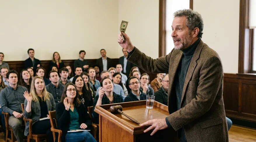 Итак, представьте, что вы сидите в аудитории. На сцену выходит профессор экономики, достает из кошелька хрустящую 100-долларовую купюру и говорит: — Я хочу продать вам эти 100 долларов с аукциона. Начальная ставка — 1 доллар.