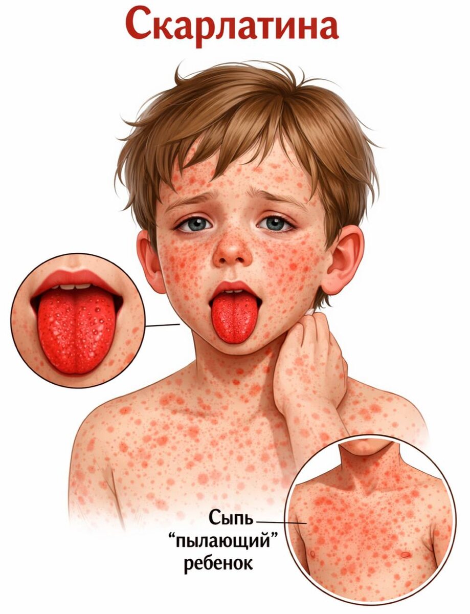 Скарлатина — это острая инфекция, которую вызывает определённый вид стрептококков, тех же бактерий, что дают ангину. Чаще болеют дети дошкольного и младшего школьного возраста, инфекция передаётся воздушно-капельным путём при разговоре, кашле, контактным через общую посуду и игрушки. Инкубационный период: в среднем 2-7 дней. Заболевание начинается остро. 🤩Обычно стартует с высокой температуры, боли в горле, слабости, отказа от еды. 🤩Ребёнок жалуется, что больно глотать, может появиться головная боль, иногда рвота. 🤩Через несколько часов или на следующие сутки возникает характерная мелкоточечная сыпь на гиперемированном фоне кожи: яркая, иногда шероховатая на ощупь, сначала на шее, груди, затем по всему телу, особенно в складках (подмышки, локти, пах). 🤩Лицо часто «пылает», а носогубный треугольник остаётся бледным. 🤩Язык сначала густо обложен белым налетом, потом становится ярко-малиновым — это тоже типичный признак скарлатины. 🤩Губы утолщаются, становятся вишневого или малин