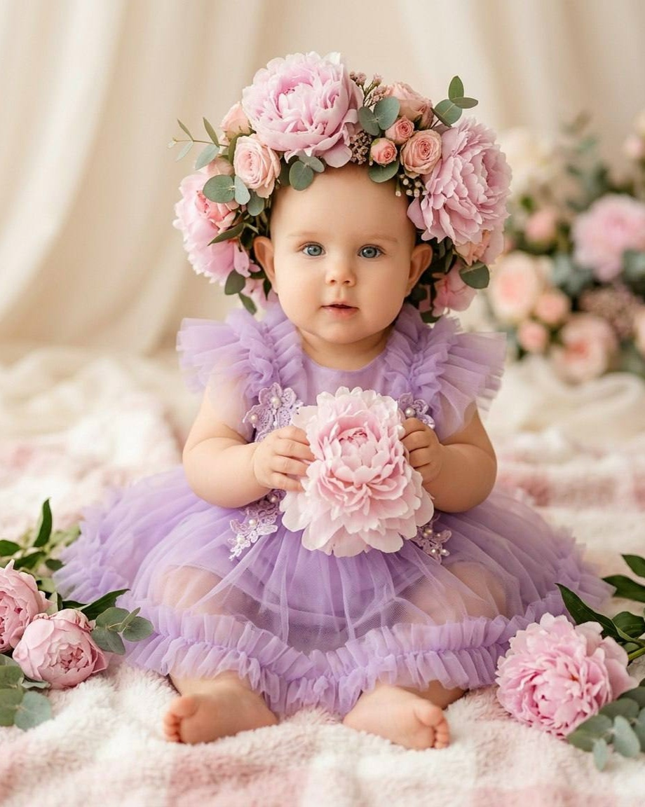 1) Заходим в БОТ ВК или БОТ ТГ 2) Жмем Выбор модели => Nano Banana PRO/Nano Banana 2 3) Добавляем свой фото (важно фото БЕЗ ретуши и любой обработки и фильтров), вставляем этот ПРОМТ: Создай не меняя черты лица Нежный студийный портрет младенца, не меняй черты лица сидящего на мягком бело-розовом пледе: малыш в воздушном лиловом платье из тюля и рюш, с объемным венком из розовых пионов на голове, держит большую светло-розовую пиону в руках; вокруг разбросаны дополнительные пионы и зеленые листья. Высокий ключ, мягкое рассеянное освещение (софтбокс), очень мягкие тени, пастельная палитра: пудрово-розовый, персиковый, кремовый и нежно-зеленый. Съемка крупным планом/полькутом, малая глубина резкости (размытый фон), теплый и мечтательный тон, текстуры тюля и лепестков хорошо проработаны, естественная поза, уютная и трогательная атмосфера. Стиль: профессиональная детская фотография, современный ретушь, мягкий виньет, высокое разрешение. Негатив: без резких контрастов, без граффити, без текс