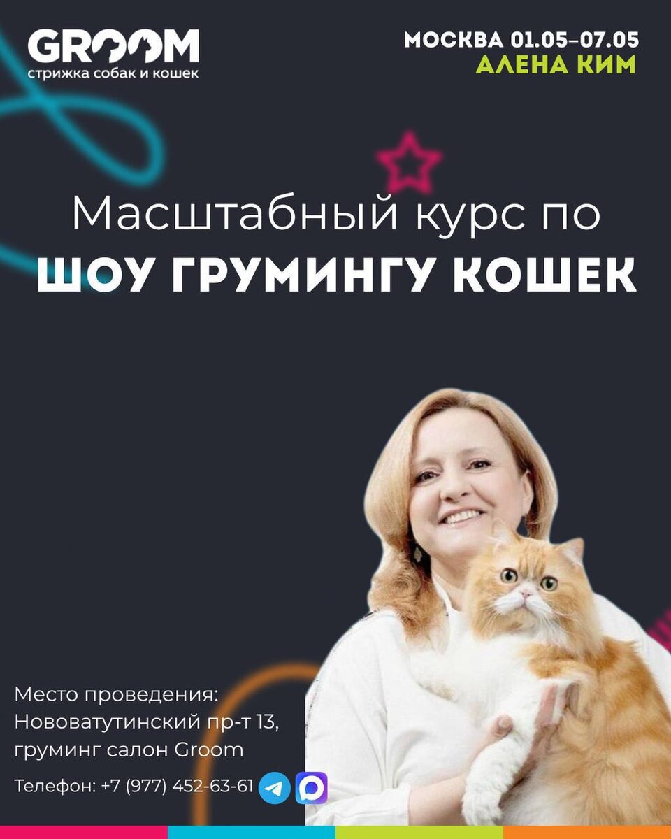 Масштабный курс ШОУ-ГРУМИНГ КОШЕК Преподаватель: Алена Ким — инструктор-фелинолог, бридер-грумер. На курсе: • стандарты 20+ пород кошек • безопасная работа с окрасами • тримминг: каким породам нужен и как корректировать экстерьер • восстановление шерсти с доказанной эффективностью • санитарно-гигиенические нормы работы • подготовка кошек к выставкам и конкурсам по стандартам международных фелинологических систем • работа с сложными кошками и их владельцами Формат: Неделя полного погружения + много практики. По окончании: Удостоверение Академии GROOM. Стоимость: 55 000 ₽ Скидка 10% при полной оплате до 1 апреля. Бронь места — по предоплате. 📍Москва Нововатутинский проспект, 13 📞 +7 977 452-63-61 Telegram / Max